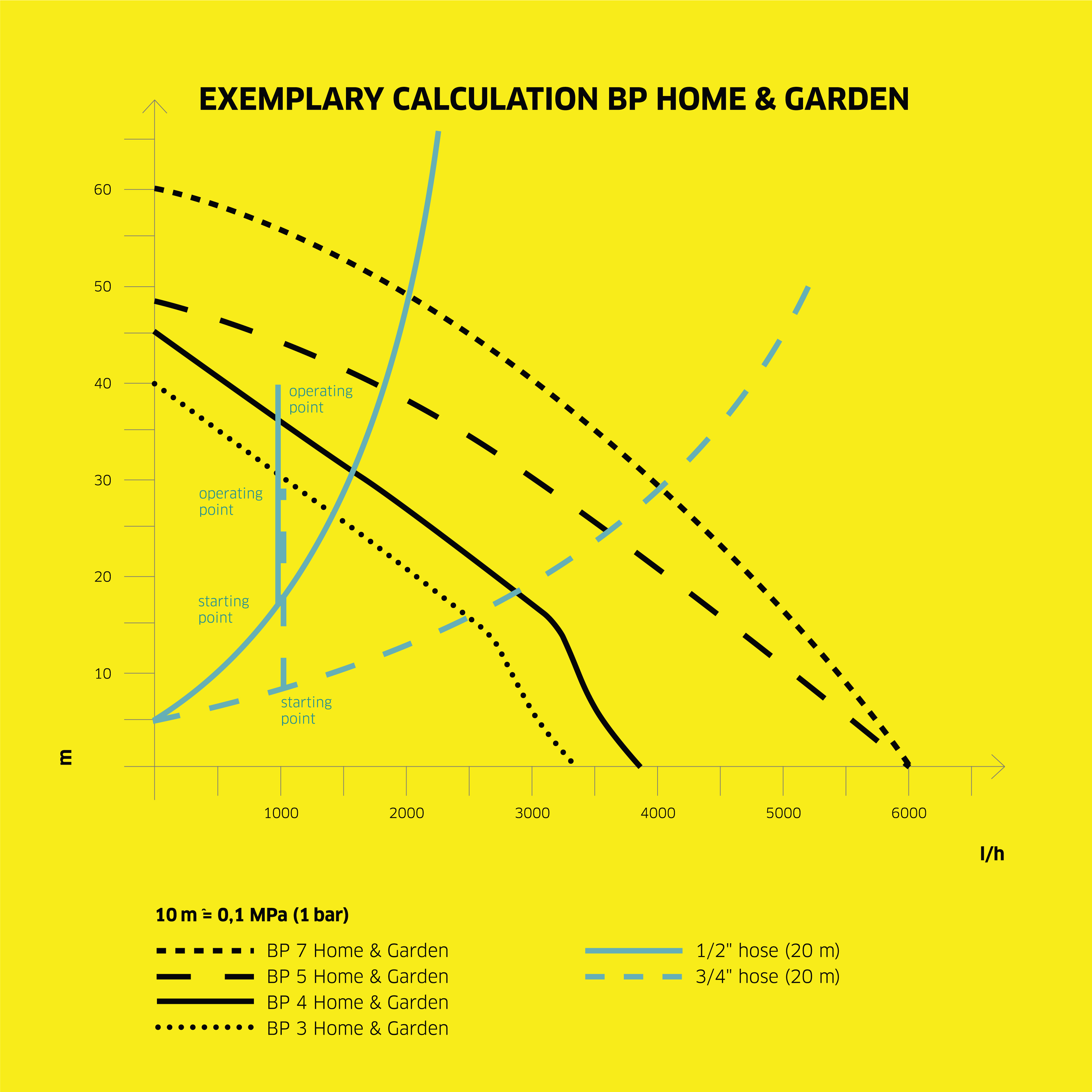 The pump performance curve above the operating point shows you the ideal pump for your application. In our example, the BP 3 Home & Garden is suitable when using of a 3/4" hose and the BP 5 Home & Garden when using of a 1/2" hose. Always select the next biggest pump for more power reserves.
